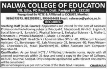 नलवा कॉलेज ऑफ एजुकेशन पानीपत भर्ती 2026: 13 पद – क्लर्क, पीऑन, चौकीदार, कंप्यूटर ऑपरेटर – अभी आवेदन करें!
